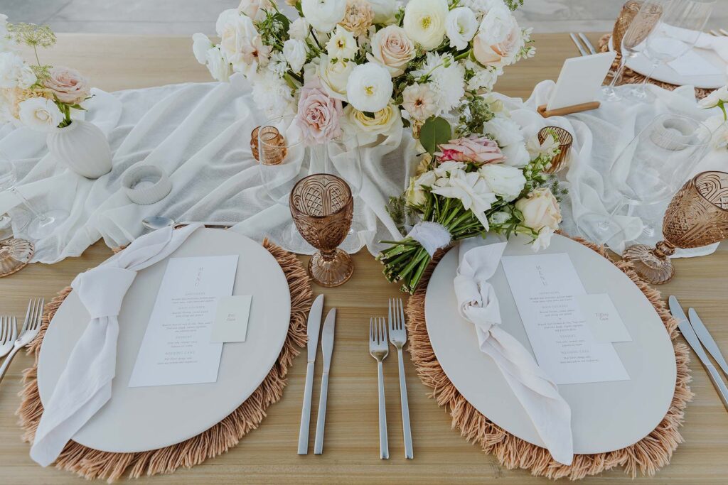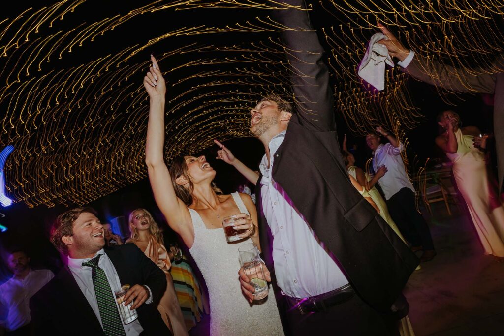 As the sun dipped below the horizon, guests enjoyed cocktails on the terrace before gathering for a candlelit reception. Tables glowed with golden light, ocean views sparkled beyond, and every detail—from soft linens to sculptural blooms—was intentionally designed to reflect the couple’s sweet, understated elegance.